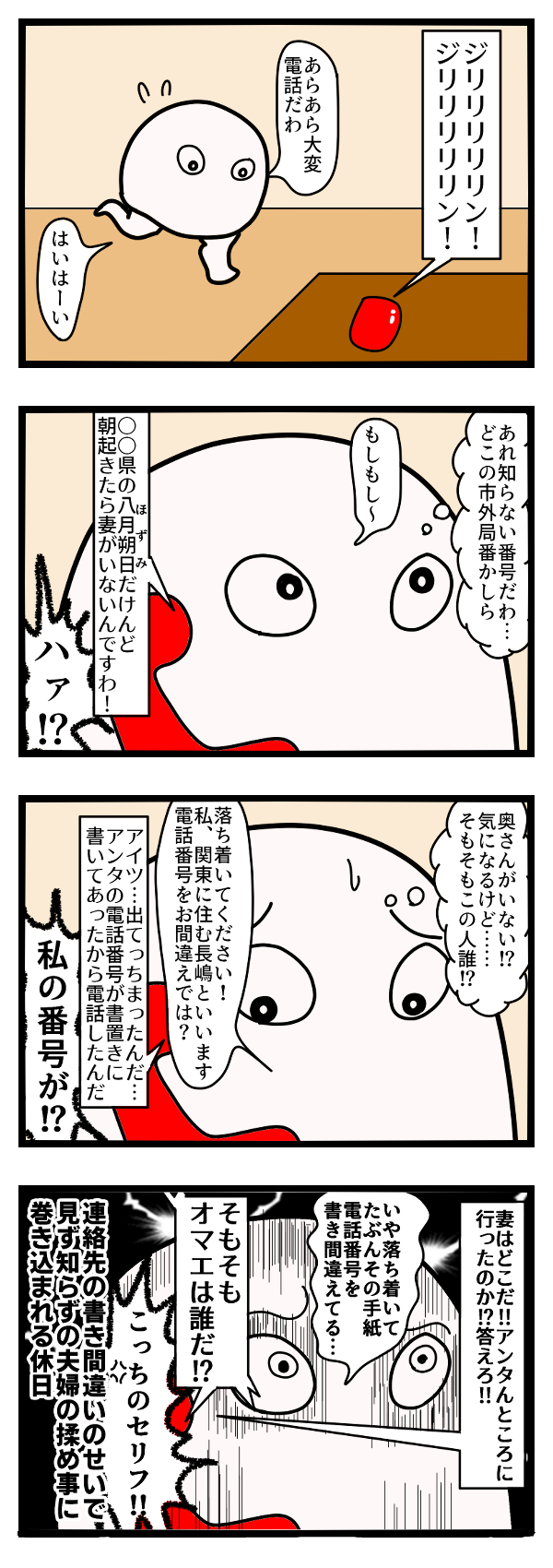 2023年08月29日 さよならと書いた手紙テーブルの上に置いたよ 控えめに言って地獄でした。夫婦の間に何があったのかは知りませんが、大切な書置きくらいは電話番号を間違えないよう、推敲を重ねていただきたいです。最終的に無関係だとわかっていただけたのですが、切り際も謝罪などなくガチャ切りでドッと疲れました。もう…そんなことしてるから奥さん出てっちゃったのかもしれないよ…と思いましたが、着信履歴から電話を掛け直す勇気はありませんでした。