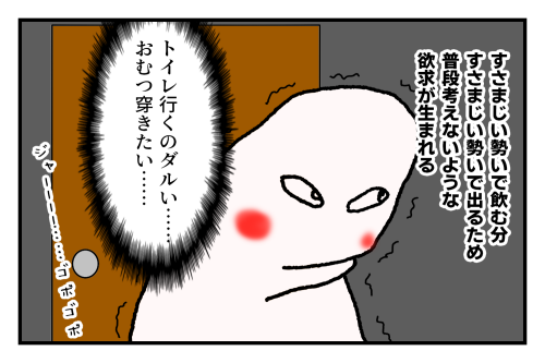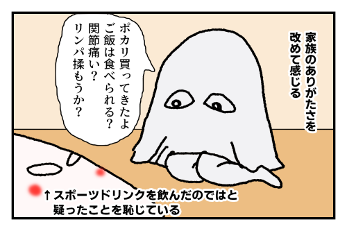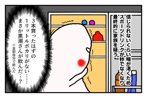 接種から約13時間後、日付が変わったあたりから急激に体調が悪くなったのですが、それと同時に喉が異常に乾きました。私は人より体積が大きいので飲む量も異常なのかもしれませんが、それでもスポーツドリンクは買いすぎかな?と思うくらい用意しておいた方がいいと思います。なお、コマの中では『ポカリ』と書いていますが、実際飲んでいたのは大塚製薬のイオンウォーターです。味の薄さが却って飲みやすくていい感じでした。