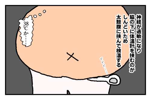 特に脇の下のような人体の弱点は敏感になるのか、体温計が触れるだけでも非常に不快で、なおかつ接種後で腕が腫れて痛かったので、私は肥満体であることを活かして太鼓腹の下に体温計を挟んで検温していました。最初は正しいか不安だったのですが、その後腕が慣れてきてから脇の下で検温しなおしたところ、ほぼ同じ温度が計測されました。太っていることで選択肢が増える数少ない例と言っていいでしょう。