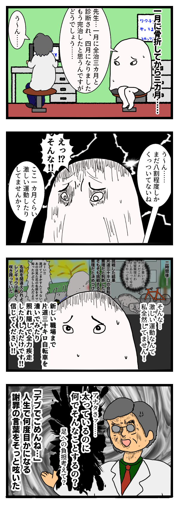 2022年04月20日 デブでごめんね! 完治したと言われたわけでもないのにデブが足に負担をかけてはいけませんでした。先生が静かに怒っていたので、職場から駅への帰り道にたまに1キロ近く走ったりしていることは言いませんでした。もっと怒られたくなかったのです。ちなみにタイトルの元ネタは、約三十年前に放送された特別ドラマ『ブスでごめんね!』です。元マラソン選手の増田明美さんの衝撃のドラマデビュー作なのですが、こういうタイトルがまかり通っていたあたり、つくづくすげえ時代だったなァと思います。