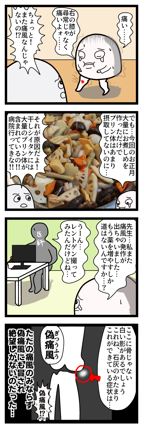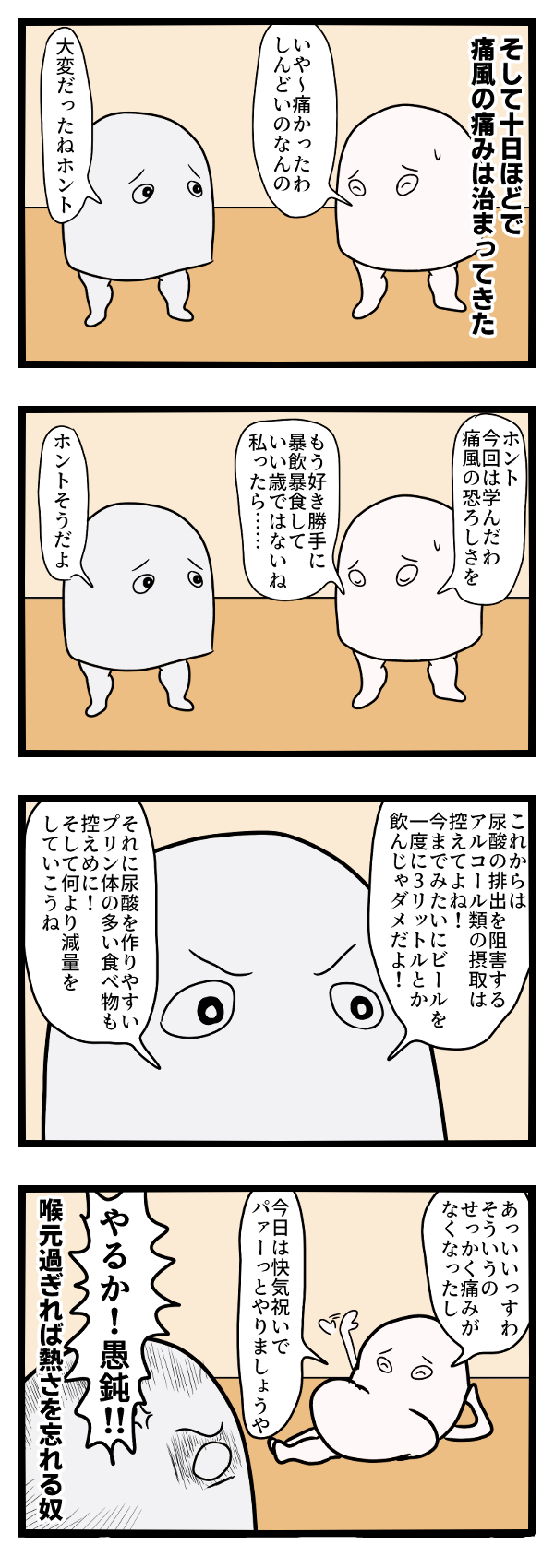 というわけでこのシリーズを描いている間に痛みも治まり、なんとか日常生活を送れるくらいになりました。とは言え、漫画の中ではこう言っていますが、しばらくお酒は一回一缶くらいにします。それに一日一錠の尿酸値を抑える薬も飲みます。最近の研究だと、食べ物に含まれるプリン体(尿酸の元)よりも、体内で作られる尿酸の方がはるかに多く、尿酸の体外への排出を阻害する要因となるのがアルコールと肥満なのだとか。やはり健康を取り戻すには節酒と節食しかなさそうですね。生きてる価値が見いだせない(ⓒ鈴木奈々)。というわけで七回にわたった痛風発現編はこれで終了です。自分の原罪が形となった病に思えてならず、七つの大罪にからめたタイトルでお送りしましたが、実際は私のみが愚かなだけですので痛風患者自体を貶める意図はありません。ご容赦いただけたら幸いです。